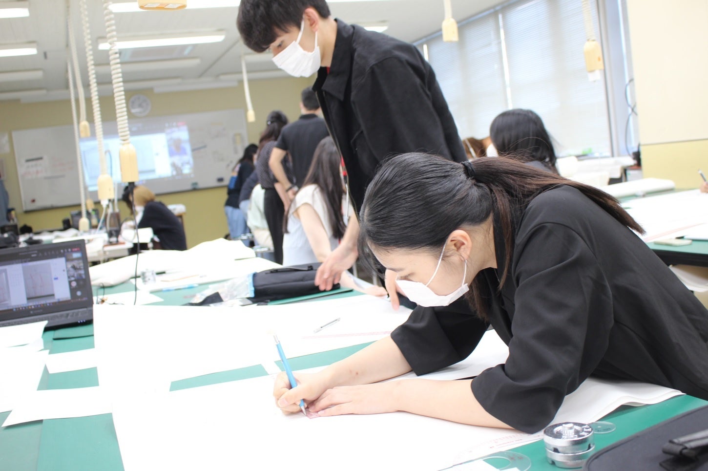 本学のファッションデザイン科は1年次にデザインやパターン、縫製の基礎知識を学び、2年次に高度な服作りを学び、デザインやコンテストに積極的に挑戦します。2年次はデザイン画の入選に向けたアイデアやコンセプトの深堀りを行い、デザインへのアプローチ理論などを授業内で対策を徹底的に行い主要な国内コンテストへ出場することで、例年多数の受賞歴を収めています。