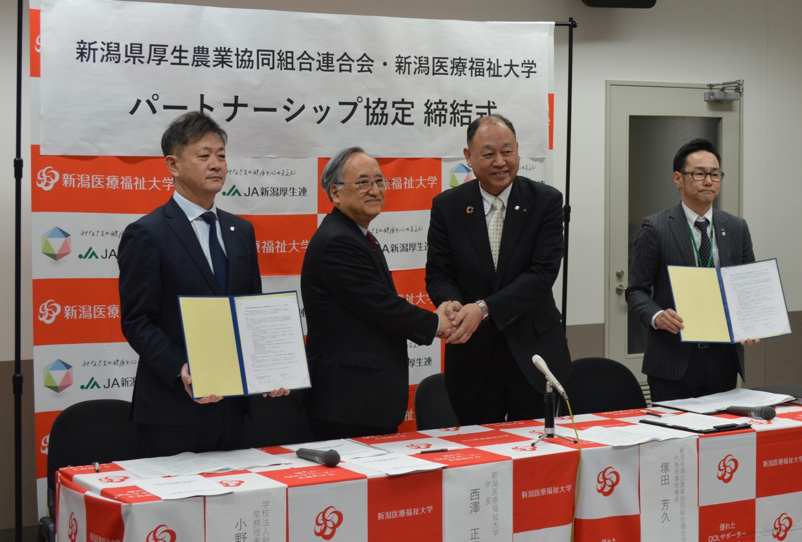 NSGグループの新潟医療福祉大学は、3月6日(水)に新潟県厚生農業協同組合連合会(JA新潟厚生連)と、教育、人材育成、学術研究、社会貢献等を推進することを目的として、パートナーシップ協定を締結しました。