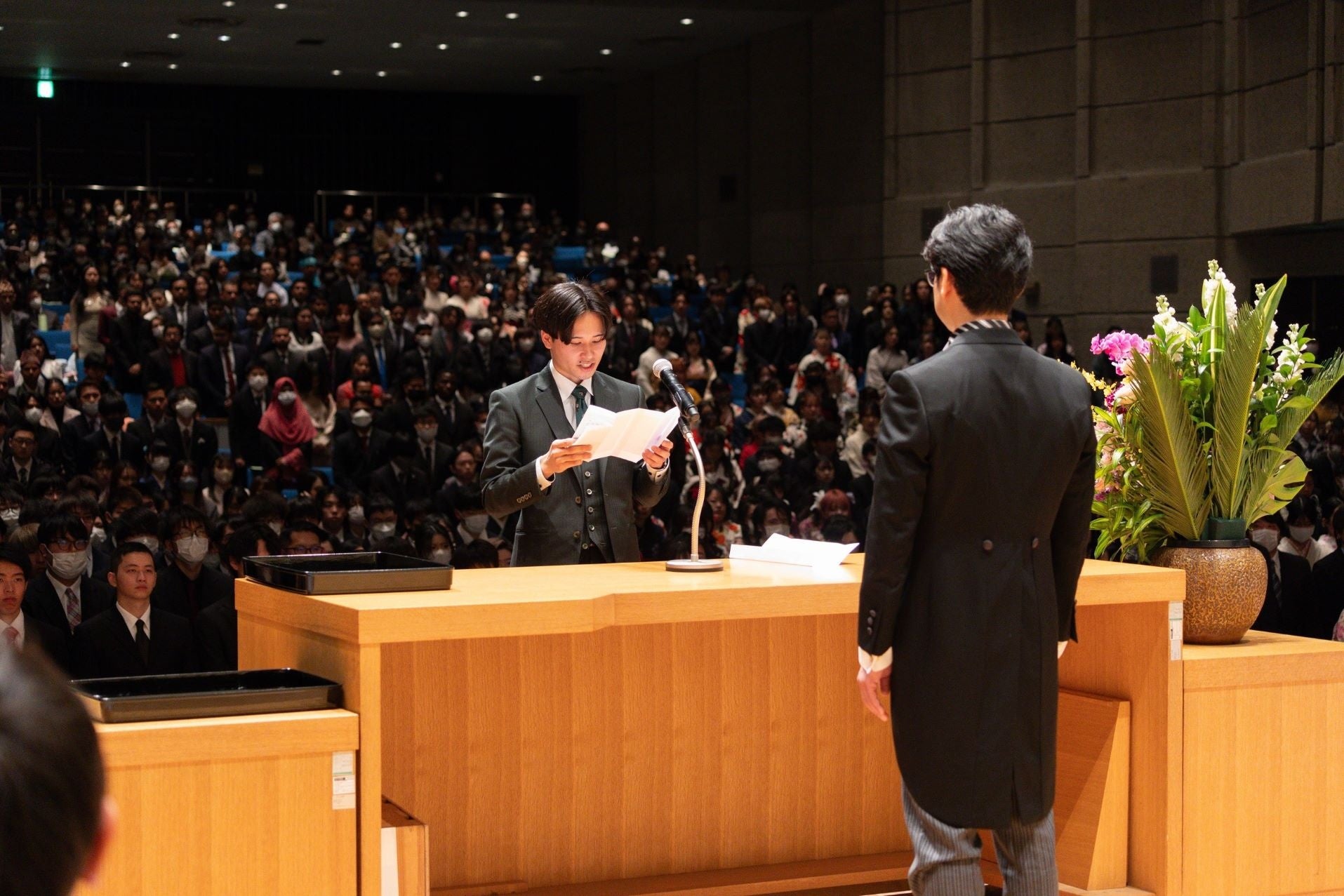 国際ビジネス公務員大学校公務員科2年の星野勝太さんが卒業生代表の答辞で「大変だった公務員試験対策授業も仲間と励ましあって乗り越え、先生方の指導のおかげで無事試験に合格出来、夢だった国家公務員になれた今後は国民の為に働きたい」と学校生活の思い出や今後の抱負を述べてくれました。