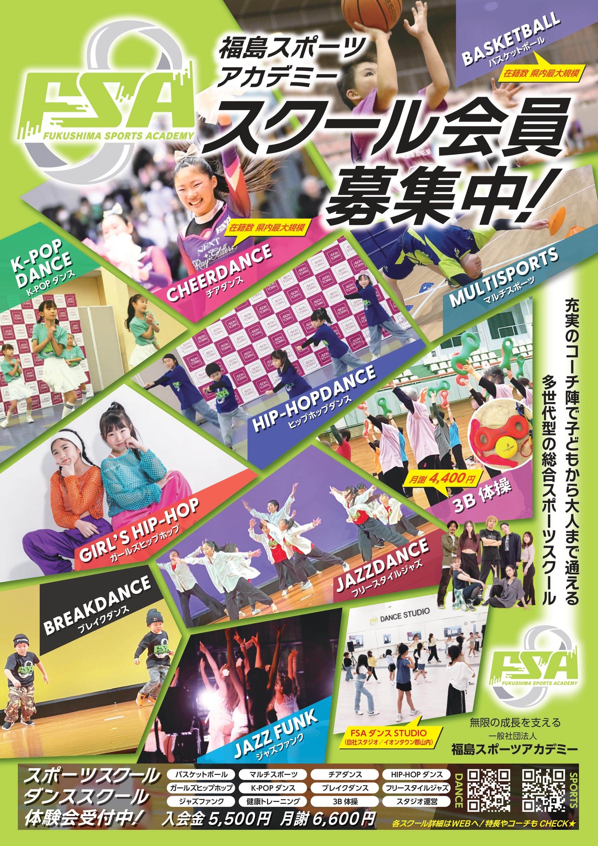 福島スポーツアカデミーは『スポーツを通じて地域の未来を担う子どもたちを健やかで元気にすること』を理念に掲げ2013年に設立、『子どもたちの無限の成長を支えるー。』この願いを込め福島県内にダンスSTUDIO(ダンススクール)、バスケットボールスクール、チアダンススクール、マルチスポーツスクール、3B体操教室を運営、今年で設立11年目を迎えました。当スクールは未来ある子どもたちの健康増進と心身育成をはじめ、幅広い世代が集う総合スポーツスクールとして地域の皆様の健康づくりとスポーツ振興に貢献し、地域コミュニティの創出、誰もが気軽にダンスやスポーツに触れることができる空間づくり、部活動の地域移行への対応等、スポーツを通じた地域貢献と社会貢献を目指して参ります。