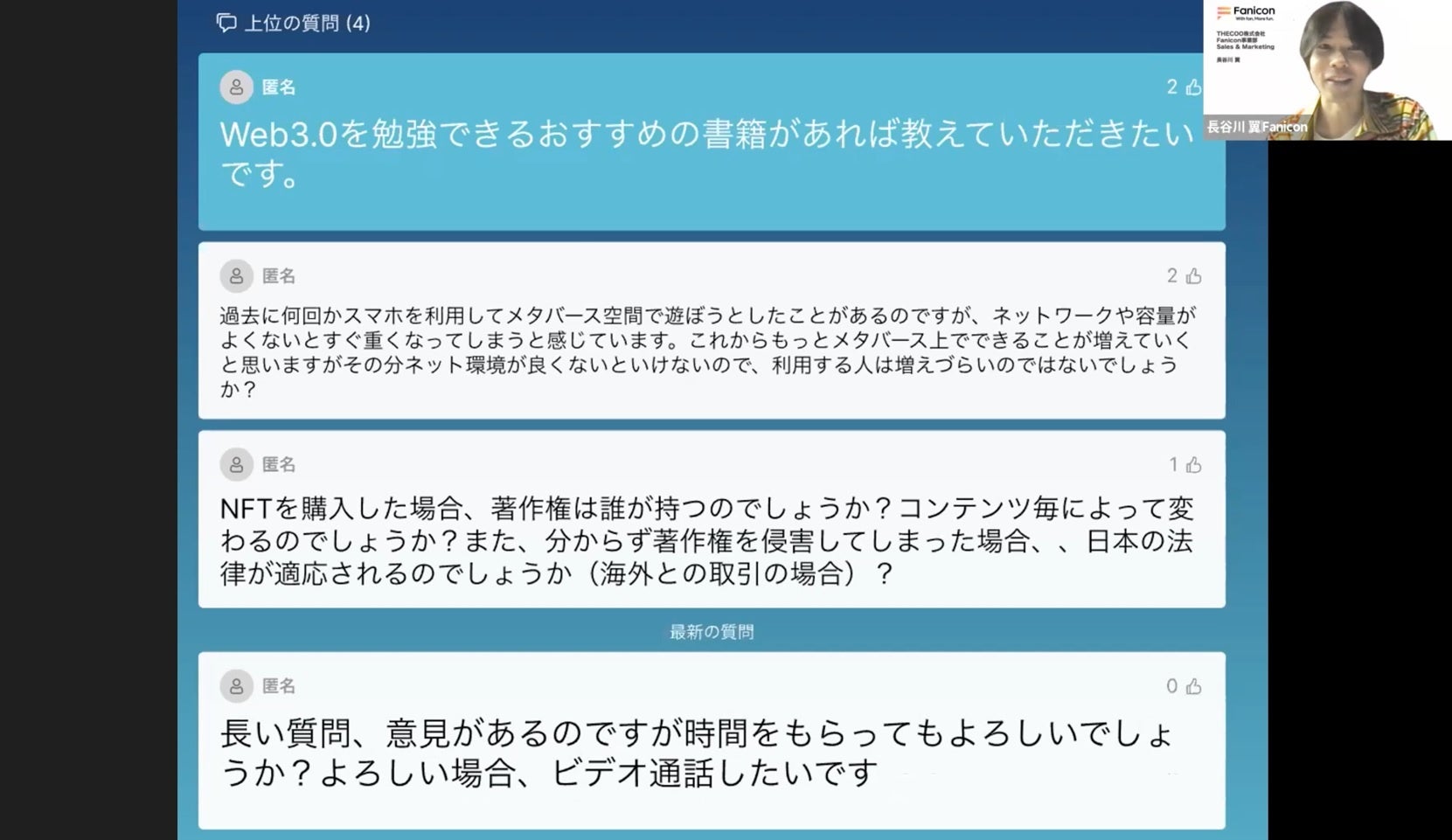 最終回のゼミ後には学生からの質問も多く、『NFT(デジタルコンテンツ)を購入する時や、メタバース上でトラブル等が起こる事が考えられると思うのですが、法整備は整っているのでしょうか?』