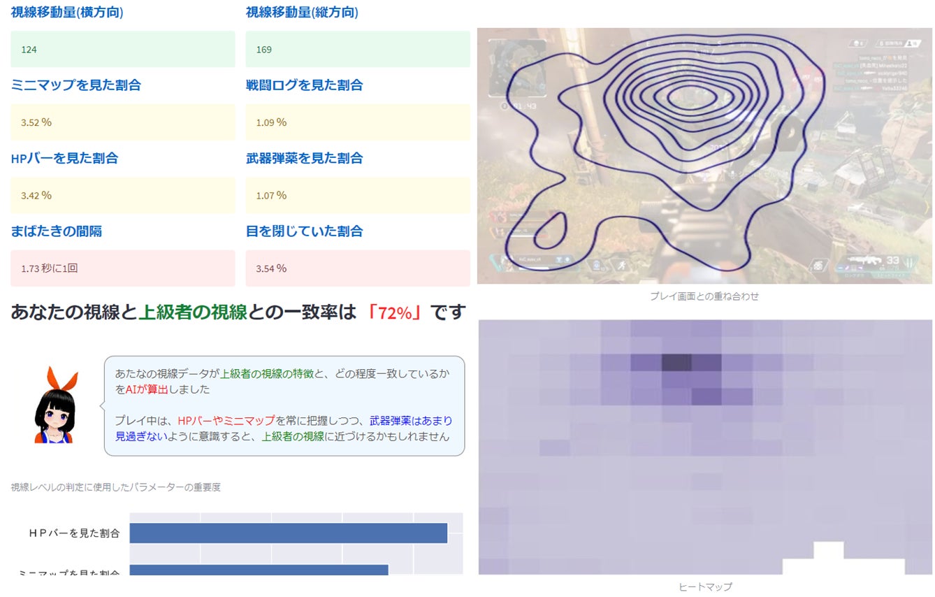 新潟コンピュータ専門学校のeスポーツ科所属のプロゲーマーおよび学生から得た視線データを解析して、競技者の視線の動きが上級者の視線パターンにどの程度近いかを算出するシステムを開発しました。さらに、競技者が画面のどの位置を頻繁に見ているかの統計を、プレイ終了後に視覚化して提示することで、競技者が自身の視線の動きを認識する手助けをすることが可能となりました。これにより、競技者は自身が気づかなかった視線の癖などを把握し、パフォーマンスの向上に役立てることができます。