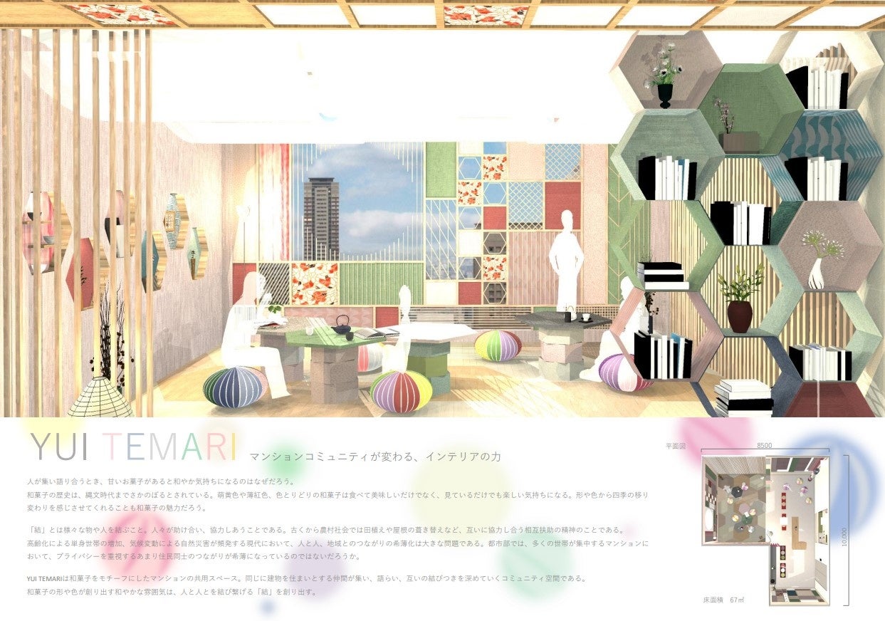 今回の作品では、コロナ禍で家族以外の人とのコミュニケーションがなかなか取れないという点に着目し、マンションの共有スペースで人と人がコミュニケーションを取れる場を考えました。この空間は和菓子をイメージし、日本の伝統食である和菓子を通じて和やかな空間になればいいなと思い作成しました。学校の先生、友人、家族のアドバイスがあったため、素晴らしい賞を頂くことができました。