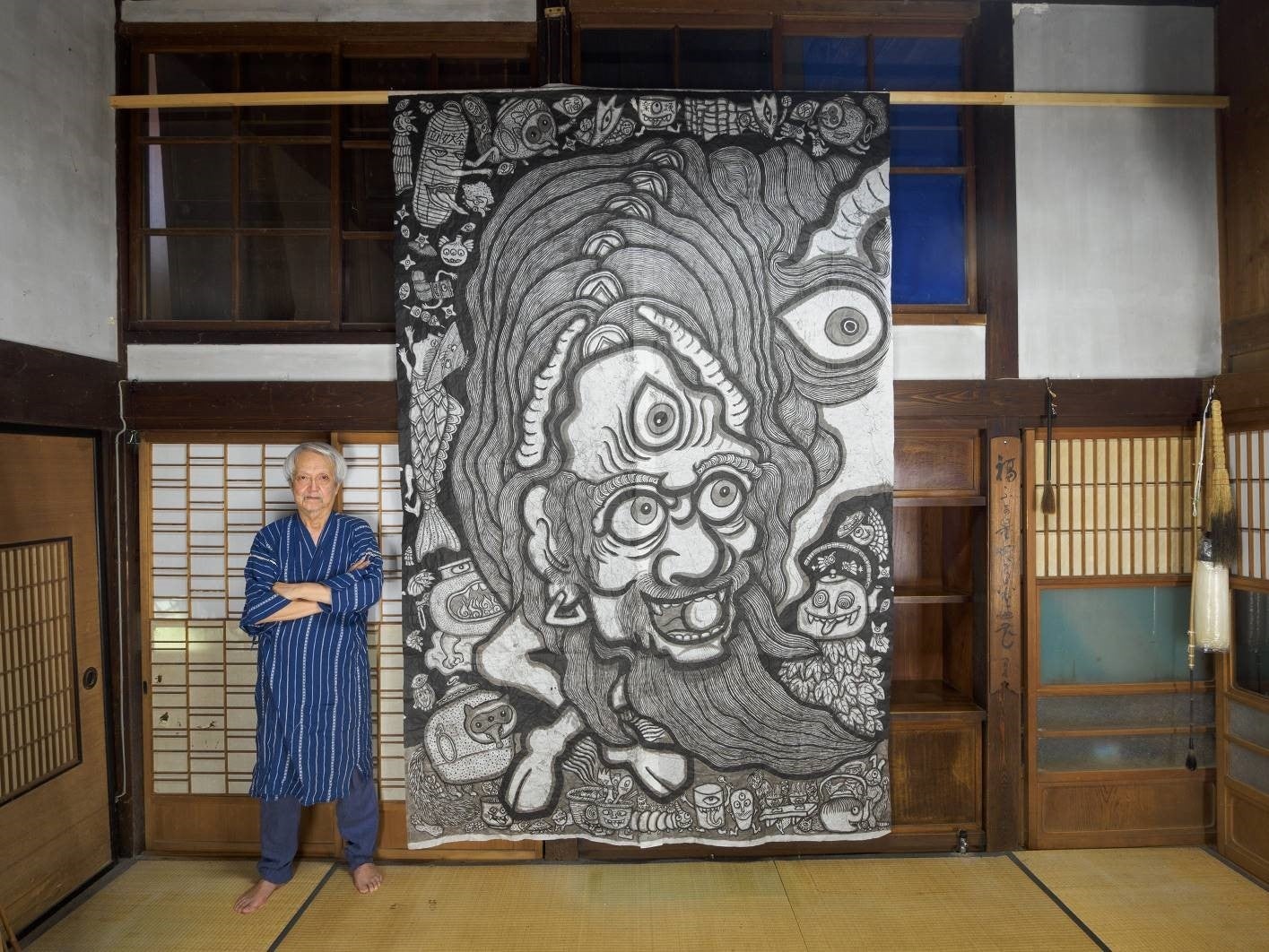 この展覧会は地域に残る民具や布に宿る精霊や妖怪、また作者オリジナルの大妖怪絵巻を展示。