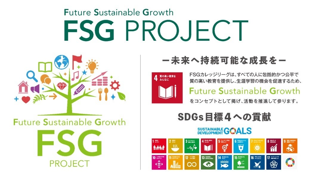 「FSG PROJECT」(エフエスジープロジェクト)とは、SDGs活動の目標4「質の高い教育をみんなに」への貢献を目的に、すべての人に包括的かつ公平で質の高い教育の提供と、生涯学習の機会を促進するため、「Future Sustainable Growth」(未来へ持続可能な成長を)をコンセプトにFSGカレッジリーグおよびFSGパートナーズ各社が連携・協力して推進するあらゆる世代を対象とした教育活動です。