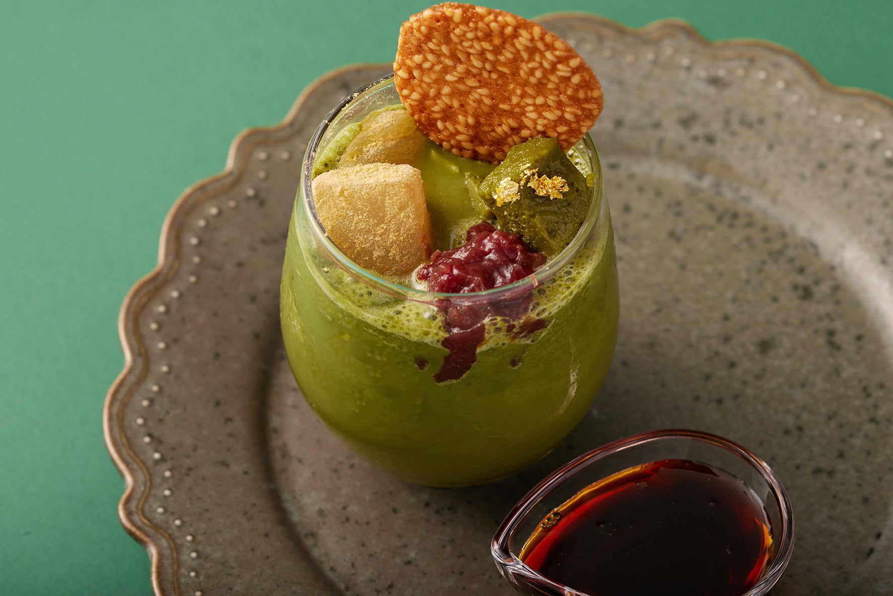トッピングにはテリーヌ、わらび餅、あんこ、ごまのチュイルを添え、さまざまな食感と風味が楽しめます。別添えの黒蜜をかけることで、さらに深みのある味わいに。