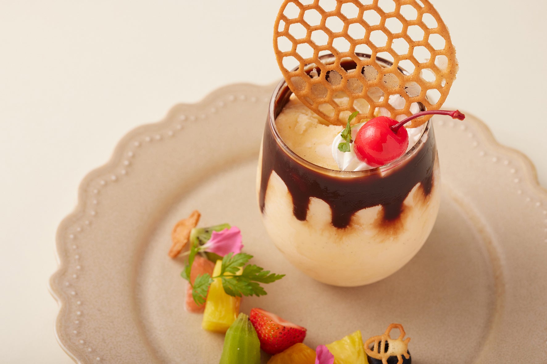蜂蜜プリンをグラニータに仕立て、チョコレートソースでかわいらしくデコレーション。