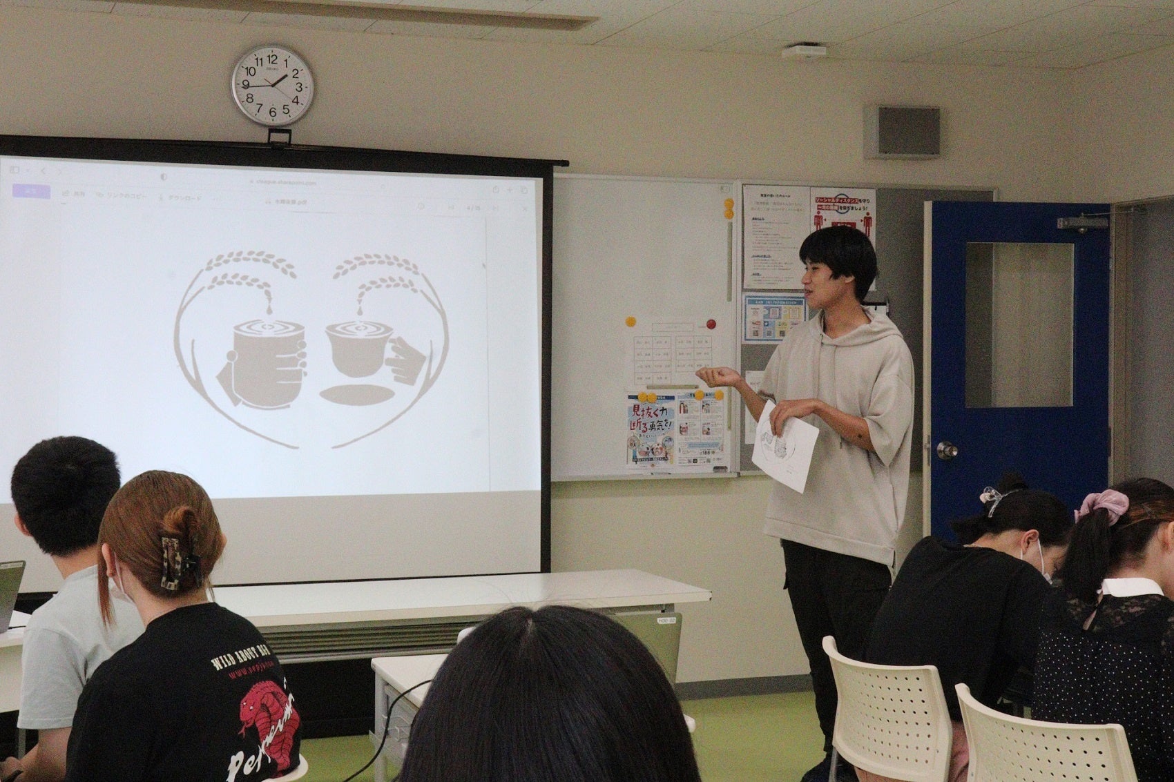 コンペ形式で行われたデザインコンテストの結果、1年生の後藤水樹さんが手掛けたデザインが最優秀賞に輝きました。表彰式と講評会では、受賞した後藤さんが喜びと緊張を隠せない表情で、「このデザインに込めた想いは、福島の豊かな自然と温かい人々の心を表現しました。ピクトグラムを使用することにより、グローバルかつハートフルに世界中の人々に福島の美味しいお米を知ってもらいたいです。」と語りました。