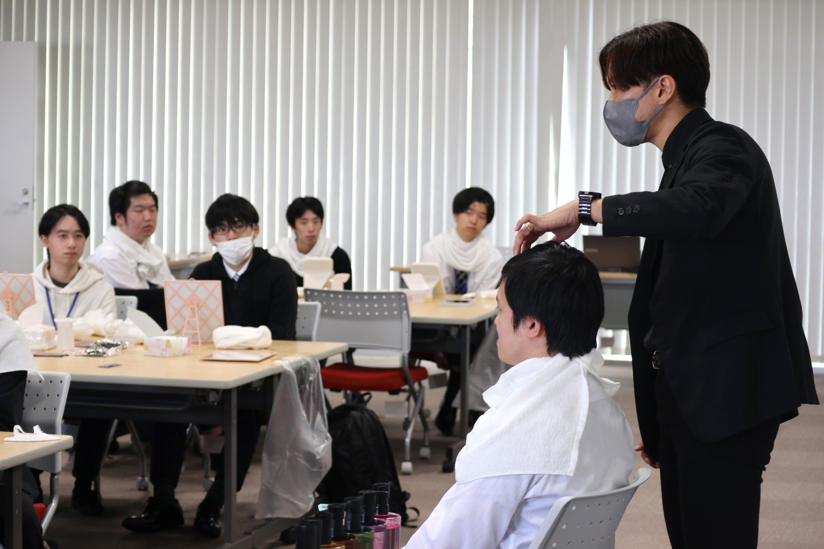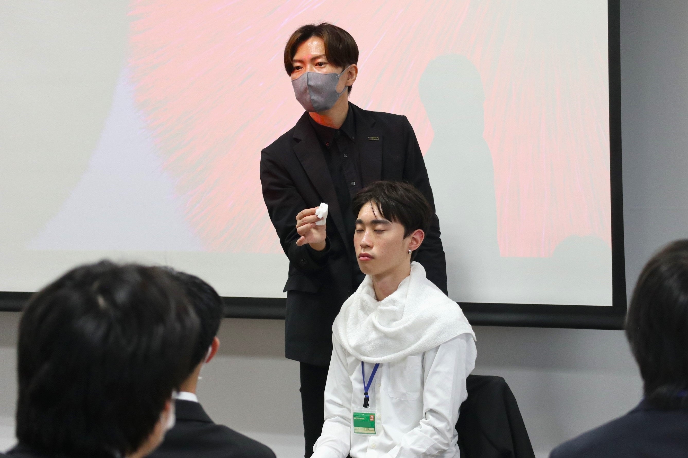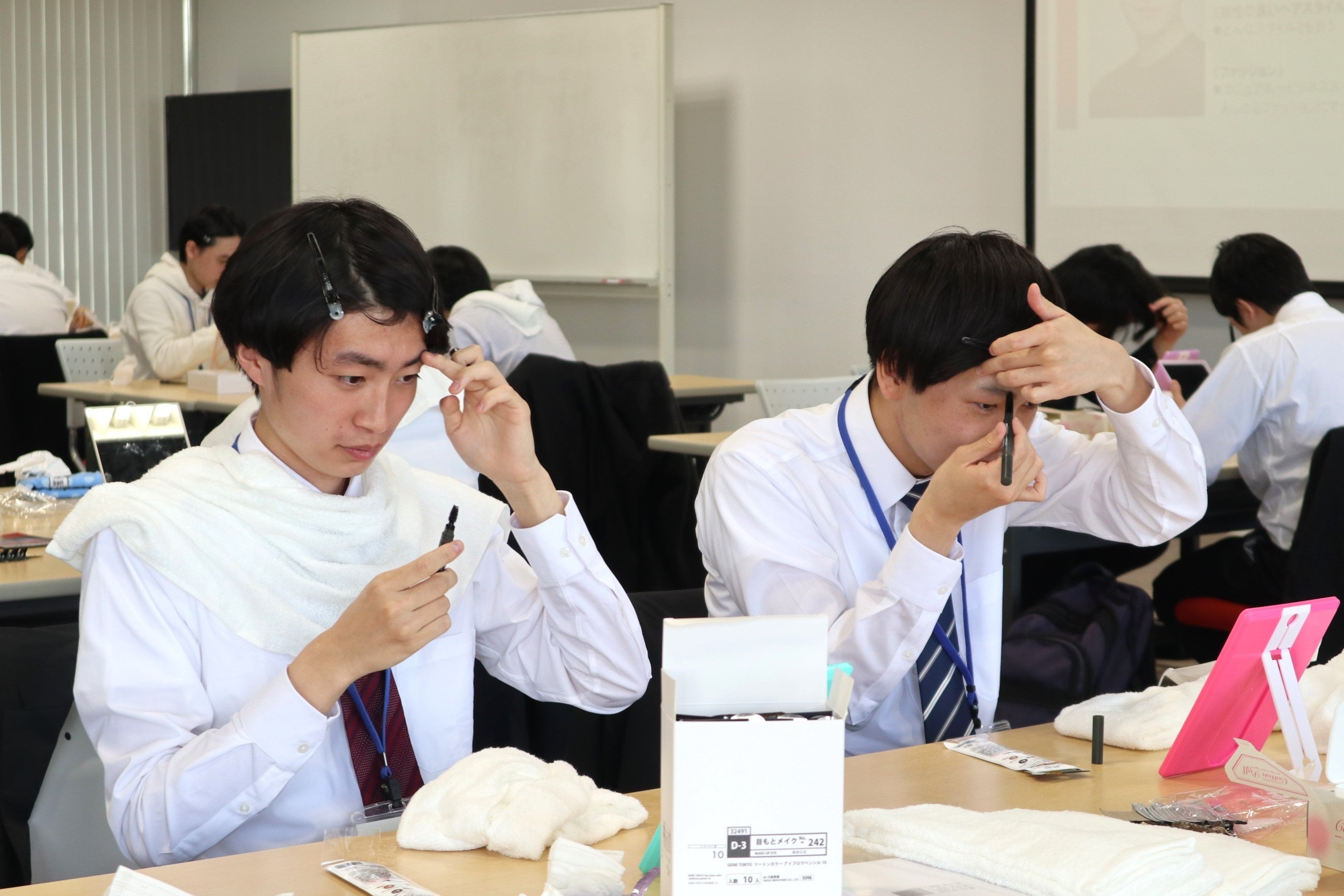 当校では身だしなみを整える一環として、男子学生が一般的なスーツの着こなしだけではなく、スキンケアやメイクの基礎を学ぶことも重要であると考え、今年度から新たにこのセミナーを実施する運びとなりました。