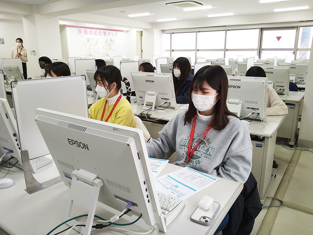 レセプト点検ソフト『Mighty Checker?』の操作を行う実践型研修です。『Mighty Checker?』は圧倒的導入実績があり、全国の医療機関で多く使用されています。在学中にこの知識と操作方法を学ぶ取り組みは、全国で初めの試みです(※)。Withコロナの教育活動を余儀なくされる時代ですが、オンラインツールの普及を最大限に活かして、医療秘書・事務学科、IT医療情報学科、ビジネスライセンス学科の1年生58名が、医療情報システムについて学びました。自宅からリモート研修を受けた学生もいましたが、どこにいても質の高い教育を受けることができる時代のメリットを強く感じました。