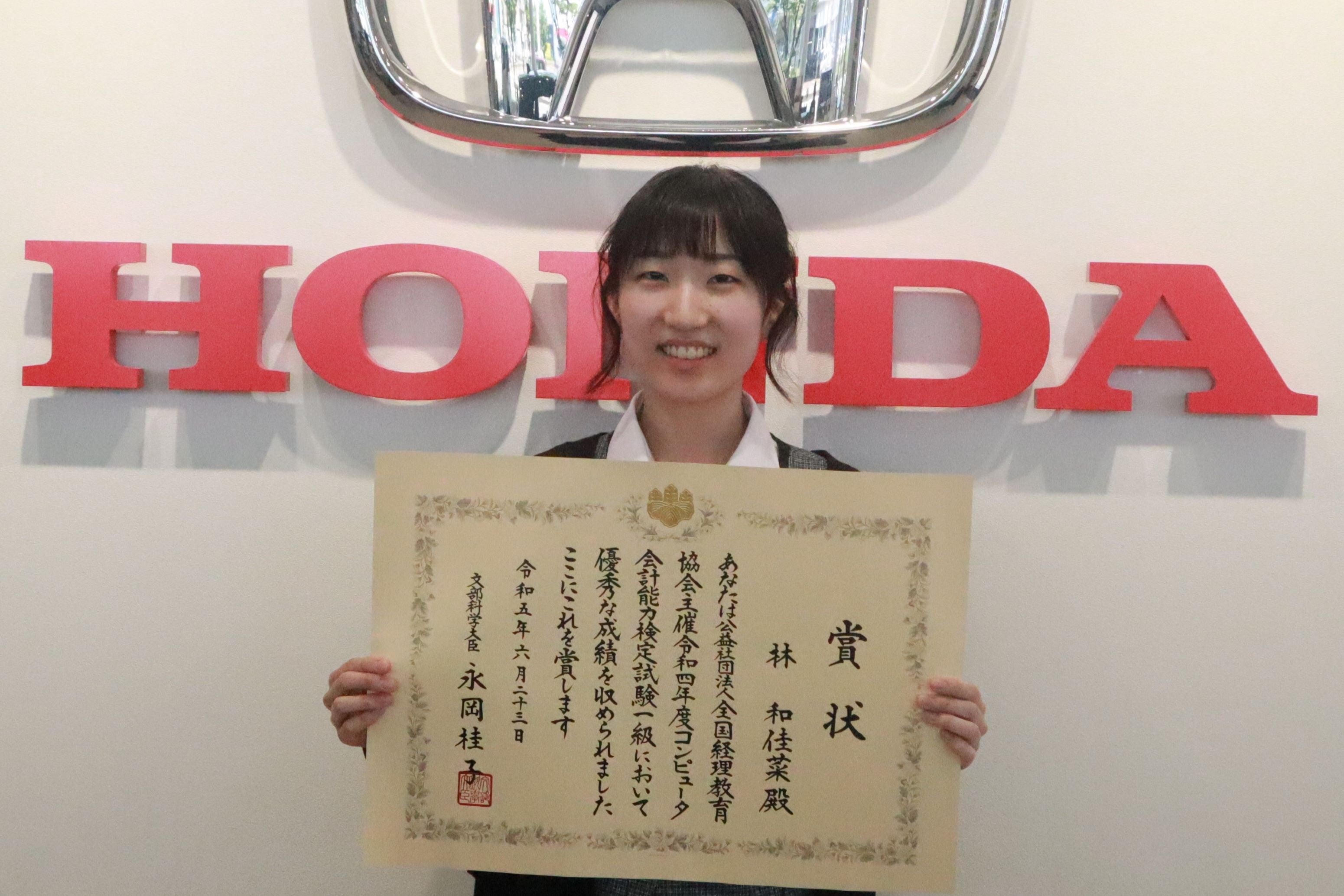 また、林さんは当校を卒業後、令和5年4月よりホンダカーズ新潟県央燕店に受付事務として就職をしています。学生時代に取得した全国経理教育協会(全経)主催検定「コンピュータ会計1級」「電卓検定十段」「社会人常識マナー検定2級」「所得税法2級」、コンペ「全国電卓競技大会 団体の部:準優勝・個人の部:3位」の実績は、現在の職場でも役立っています。
