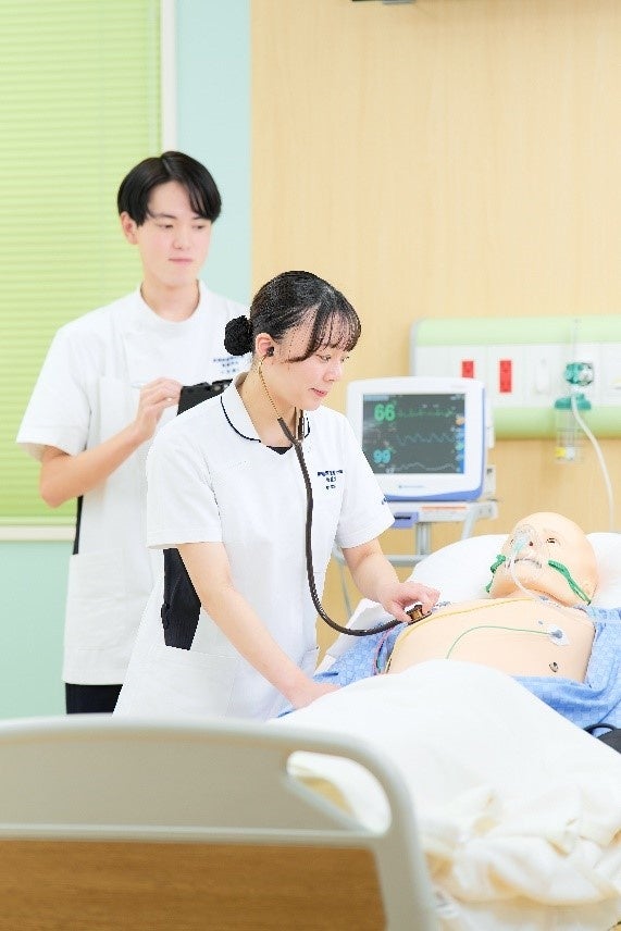 学外実習では、看護師免許を持たない学生が、実際の患者様へ医療行為を行う機会は限定されているのが実情です。本学科では、領域ごとに模擬病室(助産・小児・成人)を備えた「メディカルシミュレーション教育センター」を設置し、全国でも導入例の少ない高性能シミュレータ(模擬患者ロボット)を活用することで、臨床現場さながらのリアルな環境で看護技術をシミュレーションできる独自の教育を行っています。