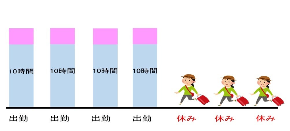 週休3日制度では、1日10時間勤務となりますが、週40時間は変わらず、年間総労働時間は少なくなります。