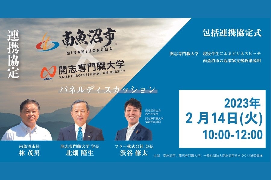 NSGグループ学校法人 新潟総合学院 開志専門職大学 情報学部(以下「本学」、新潟県新潟市、理事長:池田祥護、学長:北畑隆生)は、新潟県南魚沼市(市長:林 茂男、以下「南魚沼市」)と2023年2月14日(火)に産業振興と人材育成のための包括連携協定を締結します。つきましては、同日、包括連携協定式・パネルディスカッションの模様をライブ配信いたしますので、オンライン視聴お申込についてのご案内を申し上げます。