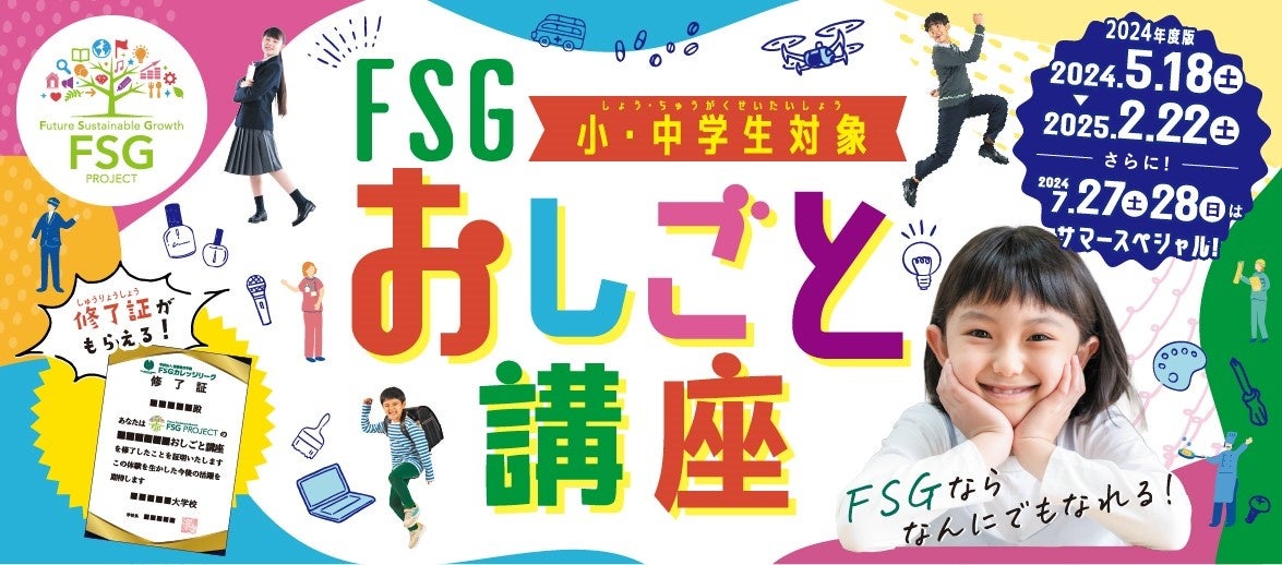 小学生・中学生の皆さんが職業に興味・関心を持ち、実際に体験することによって夢に向かって学ぶ楽しさやできる喜びを感じていただくため、FSGカレッジリーグは創立40周年を迎える本年、一昨年・昨年からさらなるパワーアップを遂げた「FSGおしごと講座2024」を、全19日程・86講座で開催いたします。
