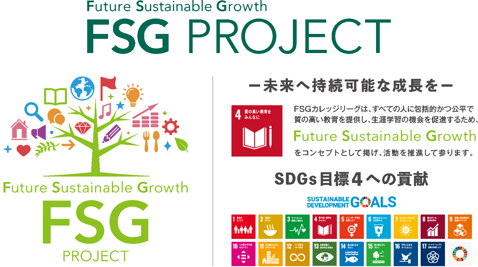 「FSG PROJECT」(エフエスジープロジェクト)とは、SDGs活動の目標4「質の高い教育をみんなに」への貢献を目的に、すべての人に包括的かつ公平で質の高い教育の提供と、生涯学習の機会を促進するため、「Future Sustainable Growth」(未来へ持続可能な成長を)をコンセプトにFSGカレッジリーグおよびFSGパートナーズ各社が連携・協力して推進するあらゆる世代を対象とした教育活動です。