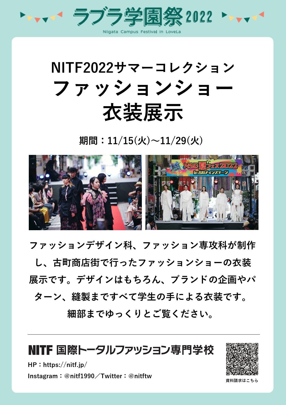 NSGグループ 学校法人 国際総合学園 国際トータルファッション専門学校(以下「本学」、新潟県新潟市)ではファッションデザイン科(3年制課程)、ファッションビジネス科(2年制課程)、ファッションプロデュース科(2年制課程)、トータルファッション科(4年制課程)、ファッション専攻科(1年制課程)が11月7日(月)から行われているラブラ万代・ラブラ2のイベントに全面的に協力させていただきます。