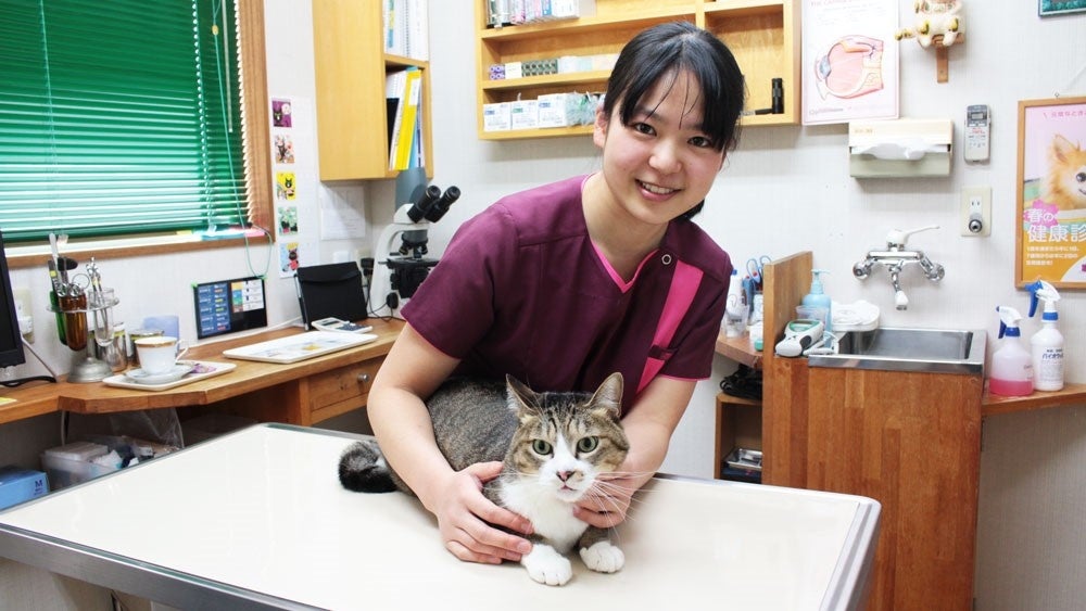 動物看護師は、獣医師が行う診察、手術等の補助業務、臨床検査、入院動物の健康管理などをはじめ、受付や飼い主対応も行う動物病院には欠かせない職業です。ペットが健康に暮らせるよう、栄養、しつけ、美容、病気の予防などペットと飼い主の日常に関わるアドバイスを行い、寄り添いながらサポートをします。