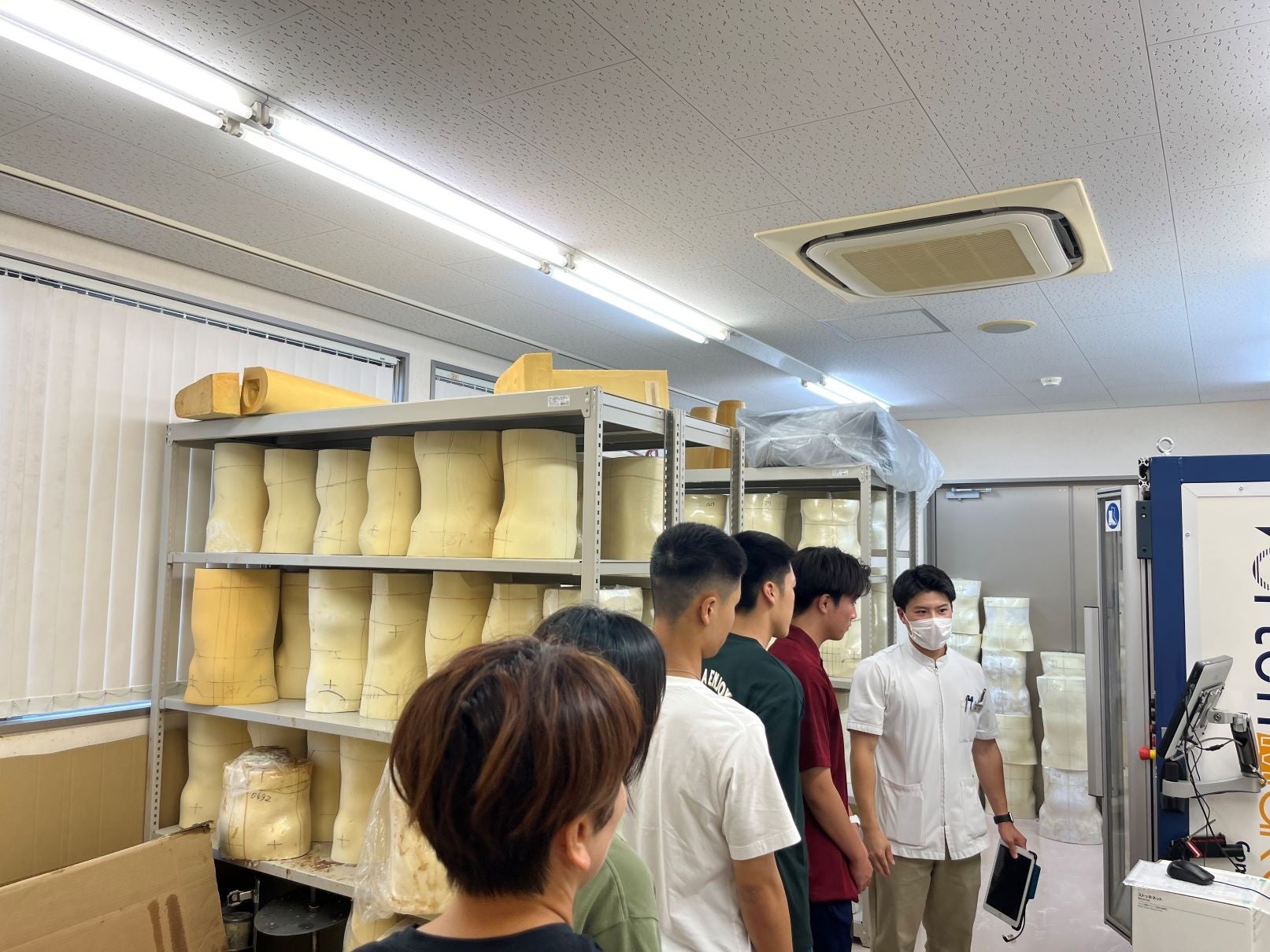 当大学の義肢装具自立支援学科の卒業生による案内のもと、義肢装具の製作やスポーツインソールの製造過程を詳しく学びました。