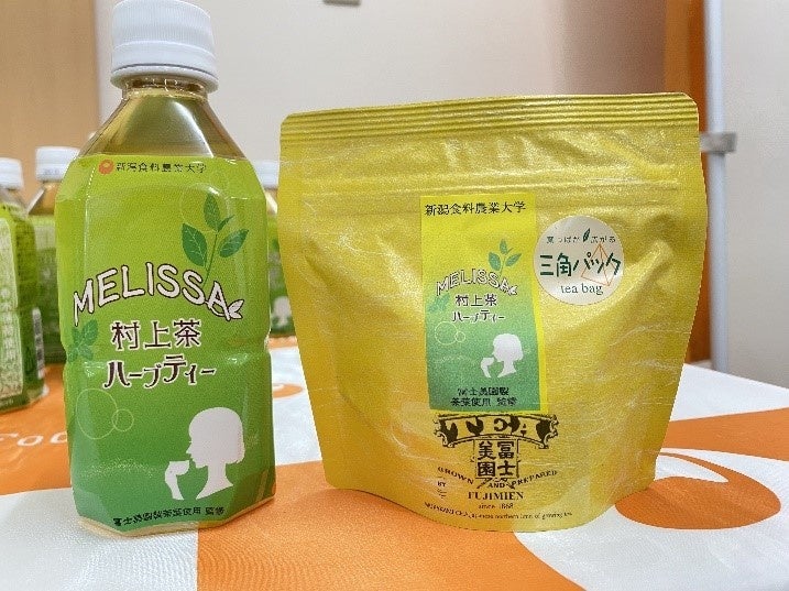 「MELISSA村上茶ハーブティー」は、本学学生の卒業研究から生まれた緑茶ハーブティー飲料です。北限の茶処として有名な香味に特徴のある冨士美園株式会社の村上茶と、香りにレモンのような爽快感のあるハーブ:レモンバーム(メリッサ)を使用し、朝日飯豊連峰の天然水で丁寧に抽出したPETボトルおよび、村上茶とレモンバームとブレンドしたオリジナルハーブティーのティーバッグを発売します。