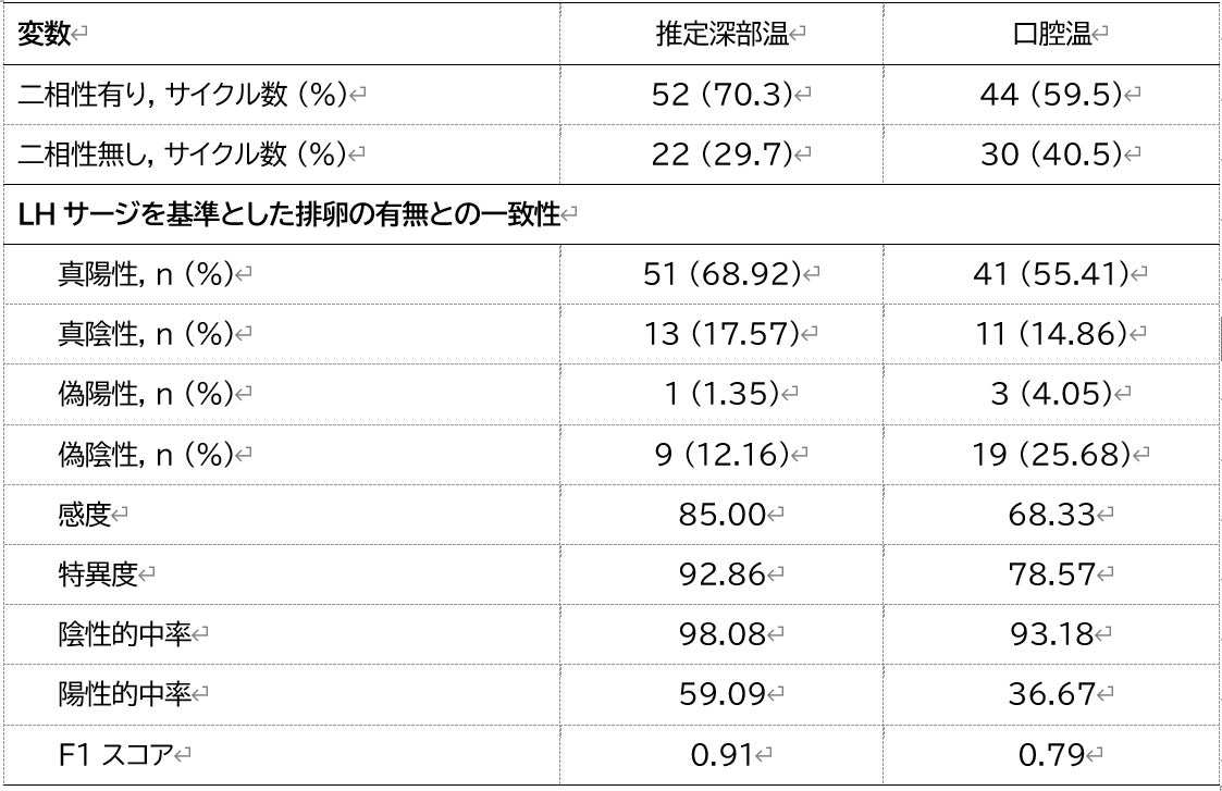 ■対象者26名(月経周期74サイクル)を対象に、推定深部温と口腔温の二相性変動から各周期の排卵の有無を推定し、尿中の黄体形成ホルモンの上昇(LHサージ)に基づく判定結果(排卵有無)との一致性を検証しました。