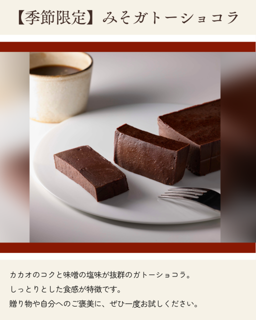 ~2/5(木)14:00までの期間中に、NSGグループの X または Instagram で応募していただいた方の中から抽選で3名さまに、くらざしきスイーツの『みそガトーショコラ』をプレゼントいたします。