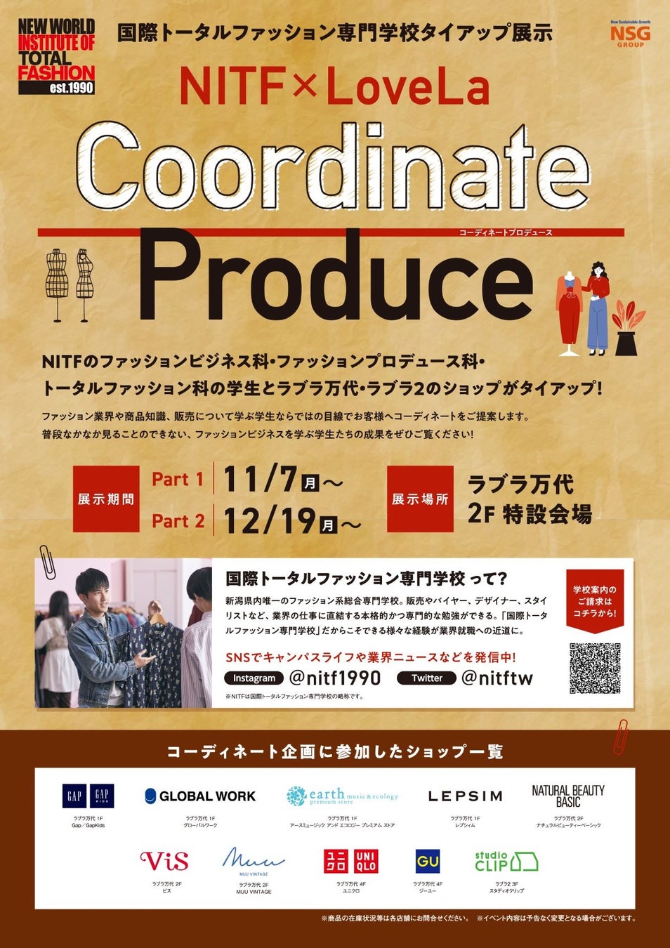 NSGグループ 学校法人 国際総合学園 国際トータルファッション専門学校(以下「本学」、新潟県新潟市)ではファッションデザイン科(3年制課程)、ファッションビジネス科(2年制課程)、ファッションプロデュース科(2年制課程)、トータルファッション科(4年制課程)、ファッション専攻科(1年制課程)が11月7日(月)から行われているラブラ万代・ラブラ2のイベントに全面的に協力させていただきます。