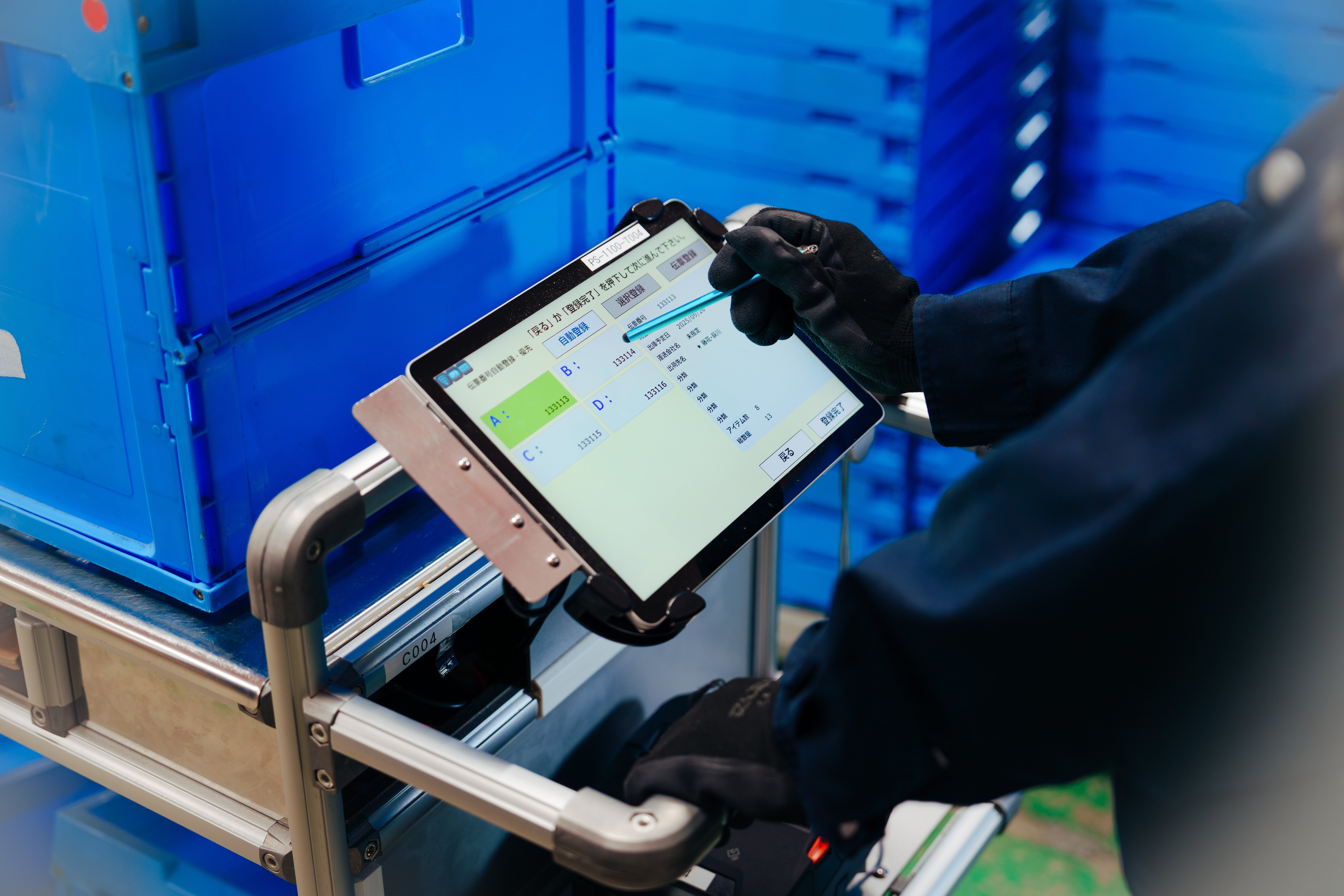 マルチピッキングカートは、4件同時ピッキングを可能にし、システムが最短・最適ルートを案内することで、従来比で歩数を約4分の1に削減しました。