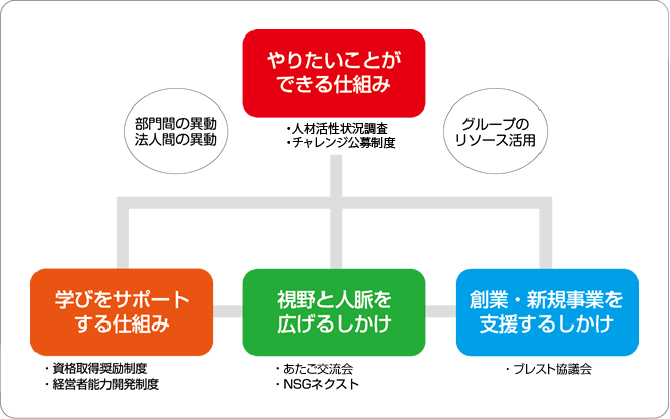 NSGグループは職員・社員の成長が、組織全体のひいては周辺地域・社会全体の成長発展につながるものと考えています。 また、人が輝く組織作りのため、職員・社員の夢・志向を把握しやりたいことがやれる仕組み、夢の実現を応援するしくみを制度として導入・推進しています。